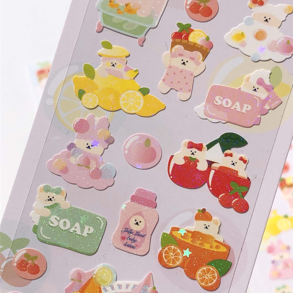 여러가지 과일들이 거품과함께 들어가있다보니까 알록달록한 입욕제 느낌도나고, 목욕테마이니까 귀여운 베이비허니 느낌도나서 데일리스티커로도 딱이에요😉버블속 과일들과 오리모양 탕을 탄 허니 과일거품으로 재주부리는 허니들까지 귀여운 디테일조각들 폭팔😚 🍒🍑